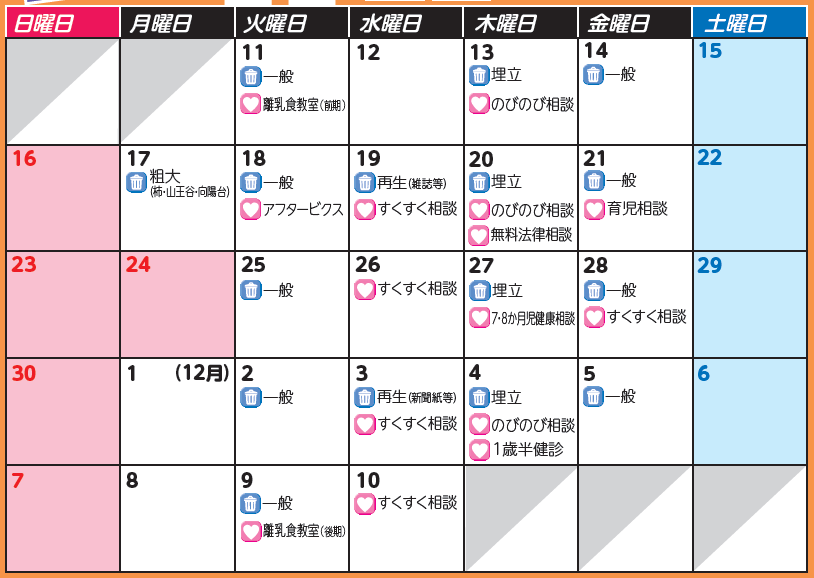 * 11月17日(月)は、柿・山王谷・向陽台地区の粗大ごみ収集日です。他地区の方は出せません。