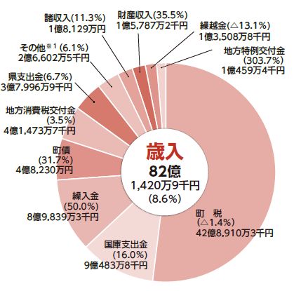 一般会計の歳入は82億1,420万8,979円となり、前年度比6億5,092万4,078円、8.6%の増となりました。増の主な理由は、公共施設建設基金等の基金繰入金の増によるものです。