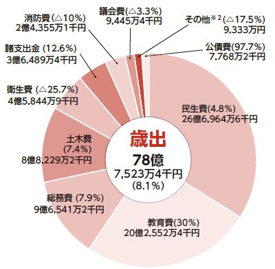 一般会計の歳出は78億7,523万3,608円となり、前年度比5億9,202万6,749円、8.1%の増となりました。増の主な理由は、中学校整備事業による教育費の増によるものです。