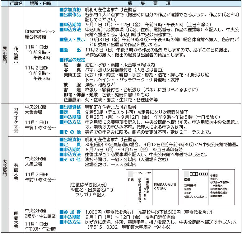 つきましては、町民文化祭への出展作品および大会出場者を下記のとおり募集します。