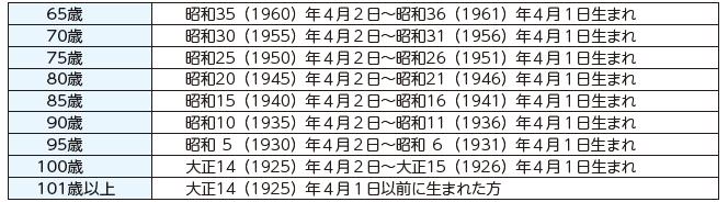 (1)明和町に住民登録がある方で令和7年度中に以下の年齢になる方