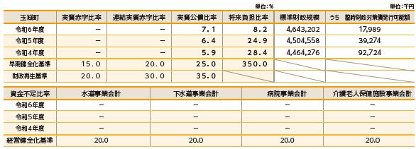 「地方公共団体の財政の健全化に関する法律」の規定により、令和6年度決算に基づく玉城町の健全化判断比率(実質赤字比率、連結実質赤字比率、実質公債費比率および将来負担比率)および資金不足比率は、いずれも基準を下回り『健全段階』となりました。