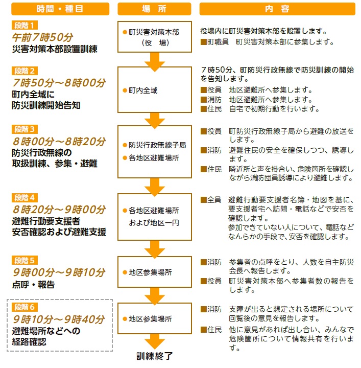 毎年8月30日から9月5日は「防災週間」です。町では、防災意識を高め、迅速かつ安全に避難行動がとれるよう、町総合防災訓練を実施します。