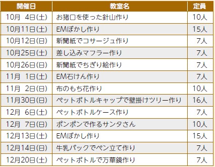参加費:各教室とも200円(EMぼかし作りは年3回まで無料)