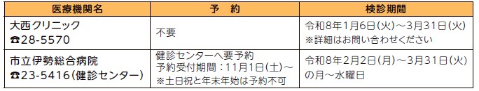 実施医療機関:伊勢市内婦人科医院(市立伊勢総合病院、伊勢赤十字病院を除く)