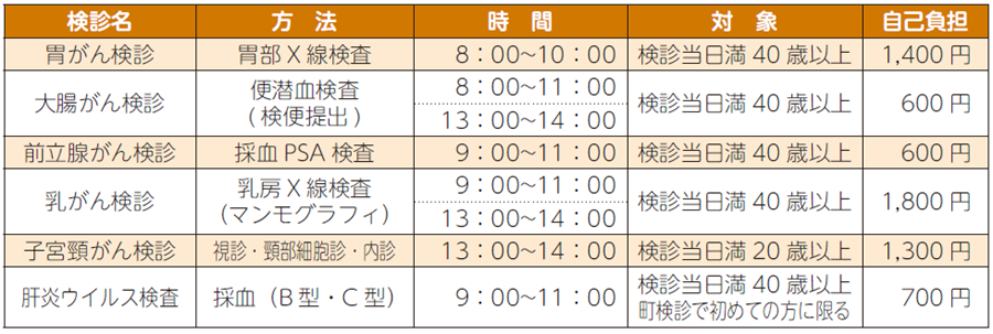 ・個別医療機関では、町の胃がん・乳がんエコー・前立腺がん・肺がんの個別検診の実施はありません。