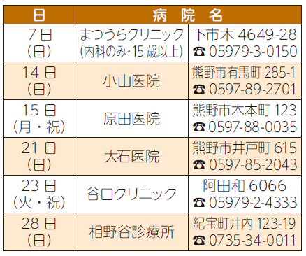 診療医院は医師の都合等により変更となる場合がありますので、来院前に必ず診療予定の医院、または三重県救急医療情報センター(【電話】059-229-1199)までお問い合わせください。