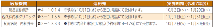 実施機関:※各自で希望する医療機関へ事前予約してください。