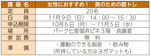 今回のテーマは「美のための筋トレ」で、正しい知識で正しく行えば、引き締まったラインや美しさ、代謝アップにもつながります。講座では、「女性の美のための筋トレのポイント」「簡単にできる実践エクササイズ」を楽しく体験しながら学んでいただけます。「運動は苦手…」という方も安心してご参加ください。