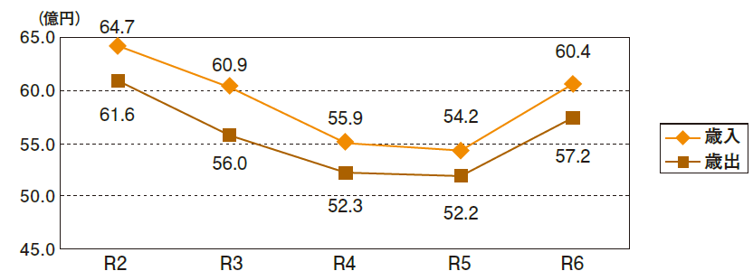 歳入規模は、基金の繰入れや地方交付税などの増加により60億4,180万円で前年度に比べ6億1,944万円増加しています。