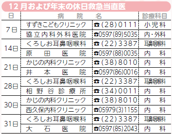 ※相野谷診療所は12月19日(金)、27日(土)、29日(月)~31日(水)が休診日です。
