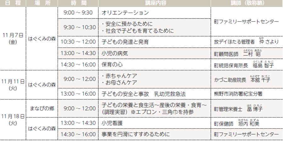 町ファミリーサポートセンターでは、子どものことを中心として、食生活、遊び、看護などについて学ぶことができる講習会を開催します。