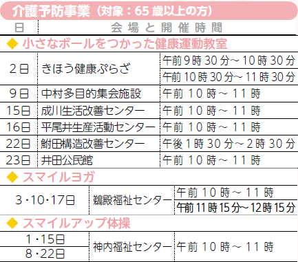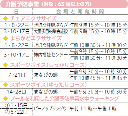 ※すべての介護予防事業は予約が必要です。詳しくは、きほう健康ぷらざ(【電話】29-3511)まで。
