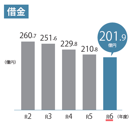 借金にあたる市債の残高は、新規借入の抑制や借金の繰上償還により、8.9億円減少し、201.9億円になりました。