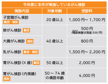市内に住民登録がある人であれば、市が実施する対象のがん検診を受けることができるうえ、検診費用の約7割は、市が負担します。