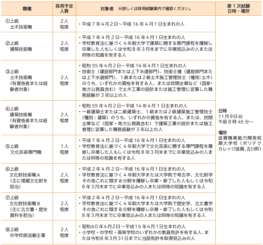 申込方法:申込用紙は、当課(市役所本庁舎3階)にあります。市ホームページからダウンロードもできます。申し込みは1職種に限ります。