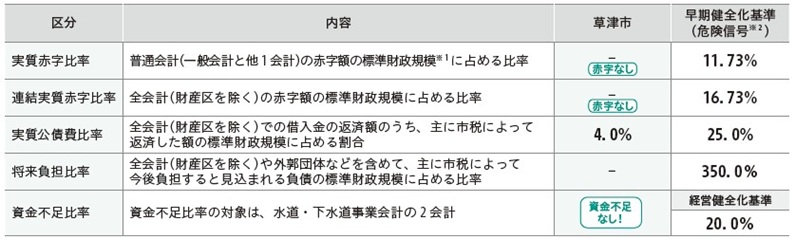 財政指標とは、全国で統一されている指標で、自治体の財政の健康診断に用いられます。財政の健全性を表す4つの指標は、いずれも基準を超えておらず、市の財政指標は良好な水準です。