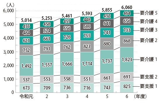 第1号被保険者(65歳以上)は3万1,508人で、前年より148人(0・47%)増加しました。要介護認定者は年々増加傾向にあり、6,060人(第2号被保険者(40~64歳)の100人を含む)で、前年より205人(3・5%)増加となっています。