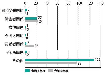 相談件数は159件で、相談内容は左のグラフの通りです。「生活支援」や「障害者」「つきまとい・いやがらせ等」に関する相談件数が多い状況です。とりわけ「生活支援」についての相談は、前年度の13件から44件と大きく増加しました。家族や地域など身近に相談できる人がなく、孤独が広がり、話し相手がいない、寂しい、社会への不満、生きづらさ、将来への不安などを抱えての相談がありました。