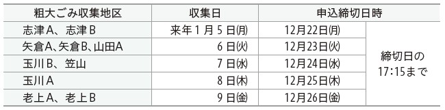 ※来年1月12日(月・祝)以降の収集は、通常どおり収集日の7日前が締め切りです。自身の収集地区は「草津市ごみカレンダー」表の右上をご確認ください