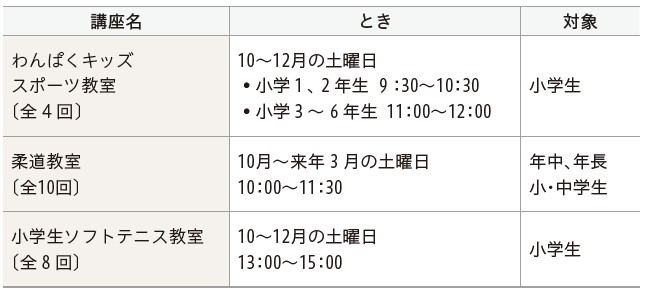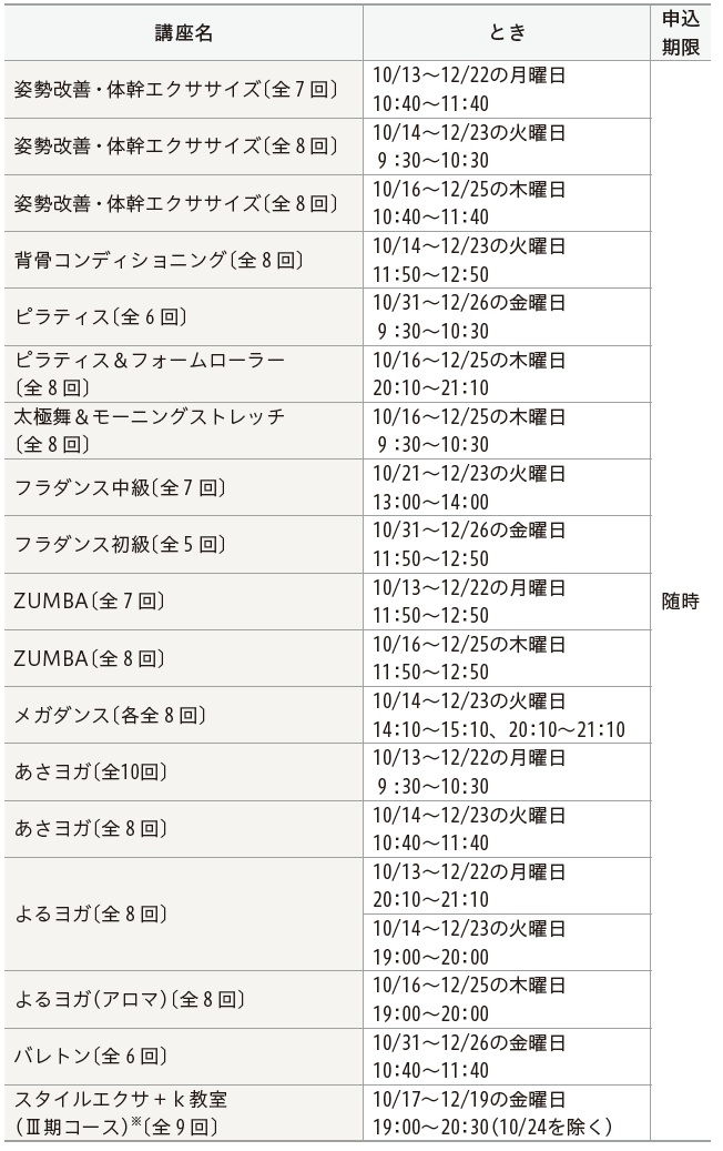 その他:10月13日(月・祝)〜12月26日(金)に、各教室の初回体験も随時受付します