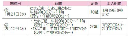 持ち物:母子健康手帳、バスタオル(赤ちゃん参加の場合)