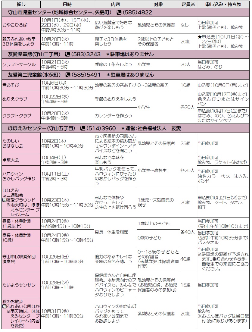 子育て [市内各児童館]ちゃいるど広場 41/53 前の記事 次の記事 発行日 : 2025年10月01日 自治体名 : 滋賀県守山市 広報紙名 : 広報もりやま 令和7年10月1日号 ★の申込方法など詳しくは、右記HPをご覧ください。 ・守山市児童センターホームページ ※定員は、特記のないものは先着順 Tweet シェアする 相談コーナー 守山10月1日号 BUNTAI calendar