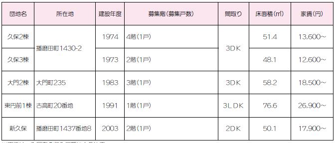 ・新久保団地、久保団地、東円前団地は駐車場あり(原則1戸につき1区画使用可。有料)。大門団地は駐車場がありません。