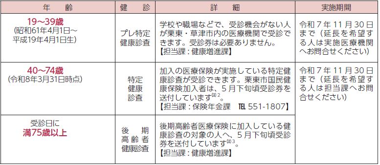 (注3)後期高齢者医療保険加入者で、病院や老人ホームなどに入院(6か月以上)や入所している人は健康診査の対象外となっています。主治医に相談してください。