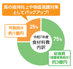 全国的に物価上昇が続く中にあっても、甲賀市では、おいしくて安全な給食を提供するため、給食費とは別に市の予算を約1億円充てています。また、給食費についても20年以上金額を据え置き、保護者のみなさんの負担を軽減しています。