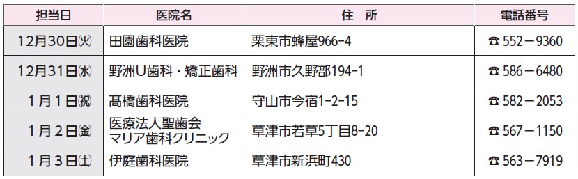 くらし 草津栗東守山野洲歯科医師会 年末年始休日救急歯科診療当番表 28/56 前の記事 次の記事 発行日 : 2025年12月01日 自治体名 : 滋賀県野洲市 広報紙名 : 広報やす 令和7年12月1日号 ※開院時間はいずれも午前10時~午後4時 Tweet シェアする 12月27日(土)~1月4日(日)年末年始により市役所は休業となります 健康スポーツセンター「サンネス」 イベント情報