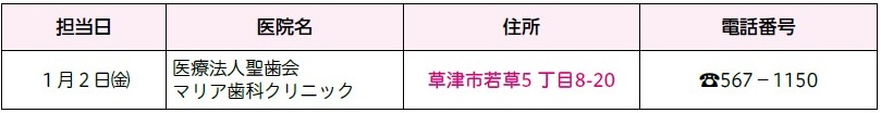 ■12月号15ページ「草津栗東守山野洲歯科医師会 年末年始休日救急歯科診療当番表」記事中、当番表の一覧に修正がありましたので、お詫びし訂正します。