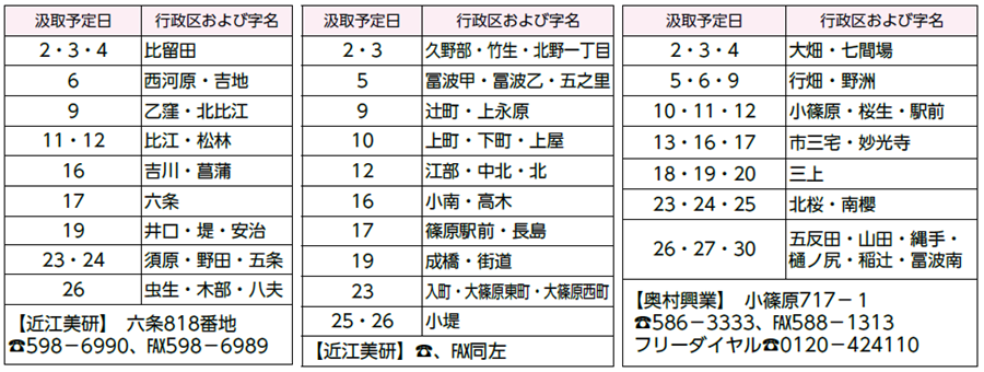 ・野洲・三上・北野・祇王(※)・篠原学区については、汲取の必要な場合は予定日の2日ほど前から「汲」の赤い旗を作業員の見える所へ出してください。旗が出ていないときは、汲取はできません。