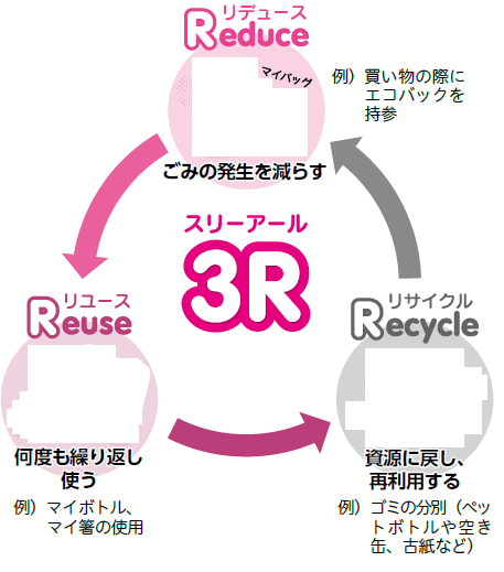 3Rとは、「Reduce…リデュース」「Reuse…リユース」「Recycle…リサイクル」の頭文字をとったもの。