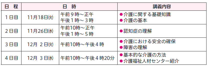 介護の仕事に興味がある人、就労を考えている人、将来のために介護保険制度や介護技術を学びたい人を対象に、市主催の研修を開催します。現場で活躍する介護のプロが講師を務めます。