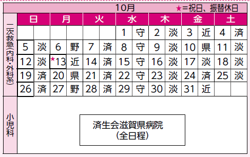 ・次の当番表は、救急搬送患者および開業医師からの紹介等により、入院等が必要な重症患者等を診療する医療機関です。