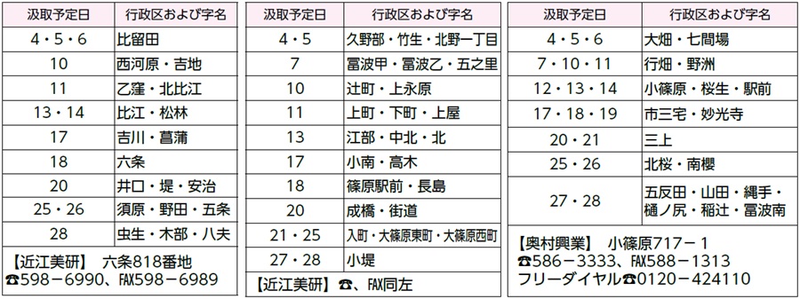 ・野洲・三上・北野・祇王(※)・篠原学区については、汲取の必要な場合は予定日の2日ほど前から「汲」の赤い旗を作業員の見える所へ出してください。旗が出ていないときは、汲取はできません。