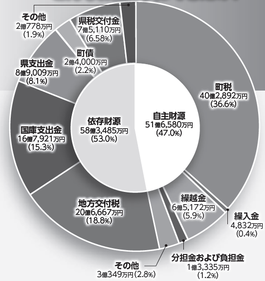 ・歳入総額は、前年度と比較すると、繰越金や地方交付税が減少しているものの、町税や国庫支出金が大幅に増加したことから、総額2億5,937万円増加しました。
