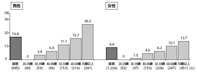 令和5年度の国民健康栄養調査の結果をみると、日本には、糖尿病が強く疑われる人の割合は男性16・8%、女性8・9%で、年齢が高いほど割合が高くなっています。