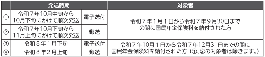 日本年金機構から「社会保険料(国民年金保険料)控除証明書」が下記のとおり送付されますので、年末調整や確定申告の際にはこの証明書(または領収書)を添付するか、申告書などを提出する際に提示してください。また、ご家族の国民年金保険料を納付された場合は、納付された方の社会保険料控除の対象となりますので、年末調整や確定申告の手続きの際にご自身の国民年金保険料の額と合算して申告できます(ご家族分の証明書を添付する必要があります)。
