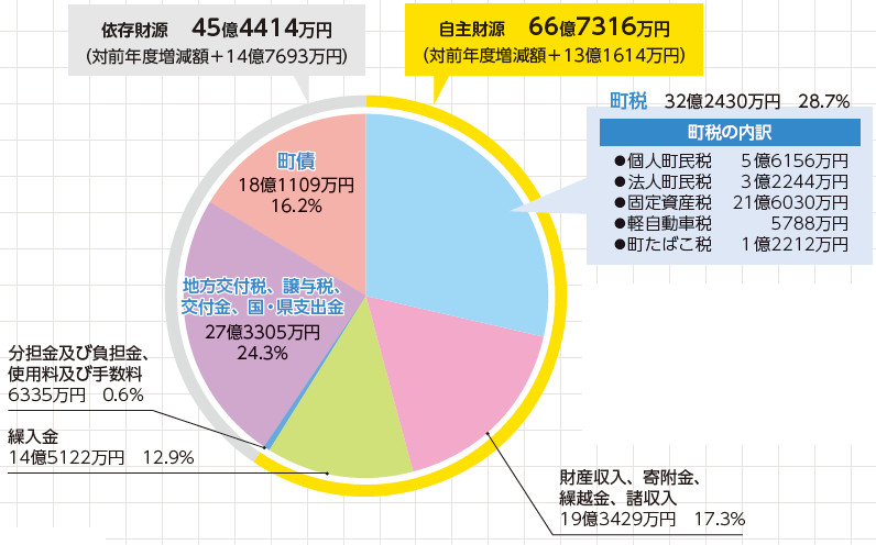 町税は、個人町民税、法人町民税及び町たばこ税が減少しました。ふるさと納税は、約15億600万円もの寄附をいただきました。町債は、中心核「交流・文教ゾーン」の整備、竜王小学校建設、総合庁舎1階改修などにより増加しました。