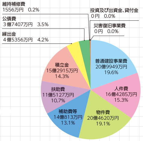 普通建設事業費については、中心核「交流・文教ゾーン」の整備、竜王小学校建設などにより5億9101万円増加しました。積立金については、ふるさと納税寄附金の増加により未来につなぐふるさと交竜基金積立金が増加したことなどから9億6567万円増加しました。