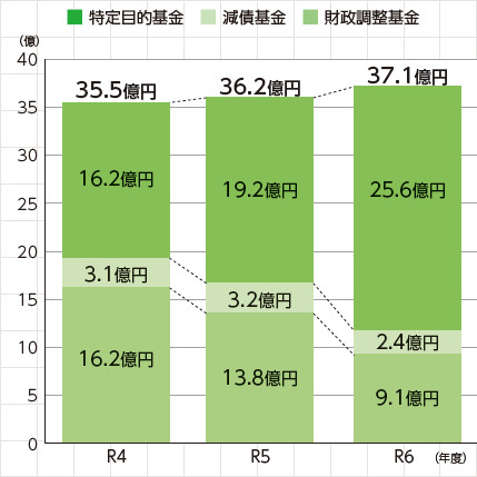 町税の減少などにより財政調整基金の残高は、前年度から4.7億円減少したものの、ふるさと納税寄附金などの増加により将来の施設整備のために、あらかじめ貯めておく特定目的基金の残高は、前年度から6.4億円増加しました。