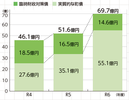 町債残高は前年度から18.1億円増加しました。これについては、財源不足に対処するための臨時財政対策債(※)の発行額が償還額を下回ったものの、普通建設事業費の増加により実質的な町債の発行額が償還額を上回ったことによるものです。
