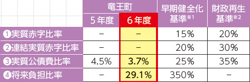 町の財政状況が良好であるかどうかを示すものの一つに健全化判断比率があります。以下の4つの比率をまとめて健全化判断比率と呼び、竜王町の比率は、いずれも基準以下になっており、財政状況は良好といえます。