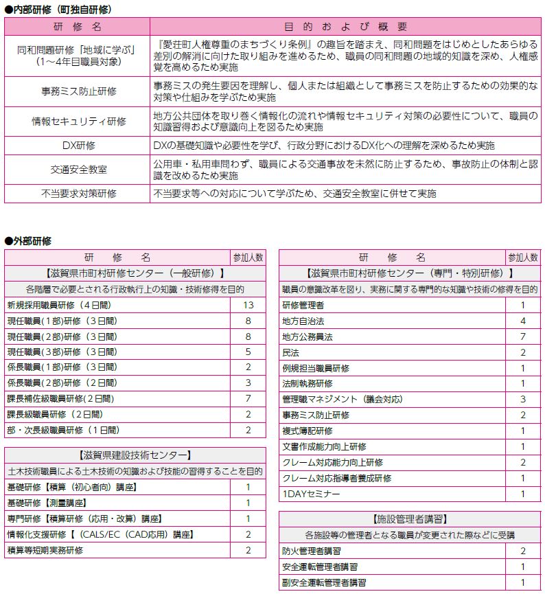 うしたことから、自らの意識と行動を改革していくような人材の育成、複雑多様化する住民ニーズに対応できる政策形成能力を備え、柔軟かつ迅速に対応できる職員の育成を図ることを目的に、より効果的な職員研修を実施しました。