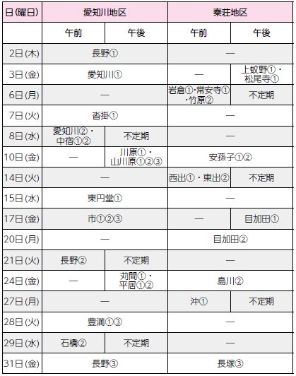 ※集落名の後にある○印の数字は、お申込みいただいた収集回数を表しています。(1)は1ヶ月に1回、(2)は2ヶ月に1回、(3)は3ヶ月に1回でのお申込みを表し、「松尾寺(1)」とある場合は1ヶ月に1回で申込みいただいた松尾寺のお宅を収集させていただきます。なお、収集予定のない集落等については、翌月以降の収集となります。