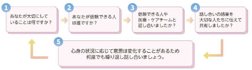 人生会議(アドバンス・ケア・プランニング、ACP)はもしもの時に備えて、自分が望む医療やケアについて、前もって考え、家族や信頼できる人、医療・介護関係者と話し合い、共有する取り組みです。しかし、必ずしも何かを決めなくても良いこと、そして、話し合いを通じて自分の想いを共有することが大切です。