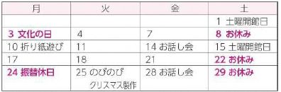 ★誕生月のお友だちに手形と写真をプレゼントします。今月は11月生まれの1歳から3歳のお子さんが対象です(町内在住の未就園児のみ)。手形と写真は、しばらくの間ひろばに飾った後、のびのびタイムの日(11月25日)にカードにしてお渡しします。11月1日~11月18日の開館日に随時行っています。詳しくはひろばの保育士にお尋ねください。