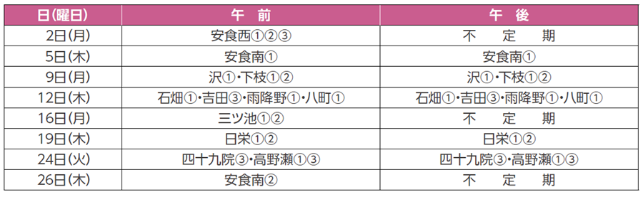 ※集落名の後にある○印の数字は、お申込みいただいた収集回数を表しています。(1)は1ヶ月に1回、(2)は2ヶ月に1回、(3)は3ヶ月に1回でのお申込みを表し、「安食西(1)」とある場合は1ヶ月に1回で申込みいただいた安食西のお宅を収集させていただきます。なお、収集予定のない集落等については、翌月以降の収集となります。
